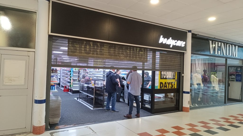 Bodycare, located at the shopping complex in Pendleton, opened for the last time today after administrators for the company said it was no longer viable to keep stores open due to stock shortages and operating costs.