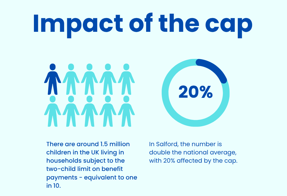 Salford is one of the areas hit hardest by the limit. According to the End Child Poverty Coalition and Resolve Poverty, 26.4% of children in the city are affected, the highest proportion in the North West. Their report also found that 45% of all children in Salford are living in poverty, and that ending the limit would bring the biggest economic benefit to any North West constituency, estimated at £10.1 million.